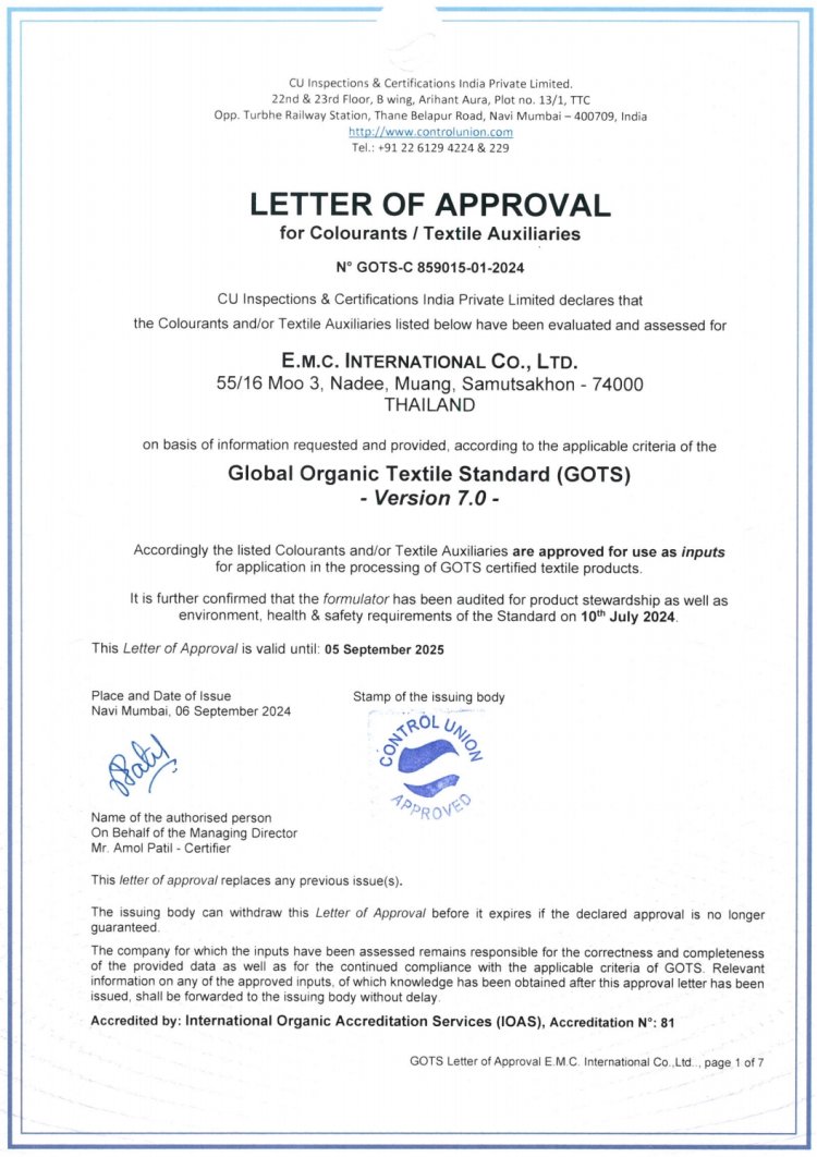 Global Organic Textile Standard (GOTS) Version 7.0 LETTER OF APPROVAL