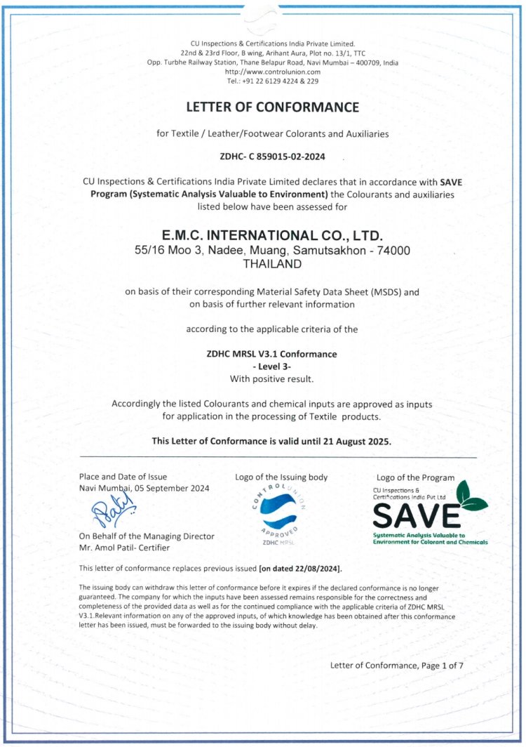 ZDHC MRSL V3.1 Conformance Level 3 LETTER OF CONFORMANCE